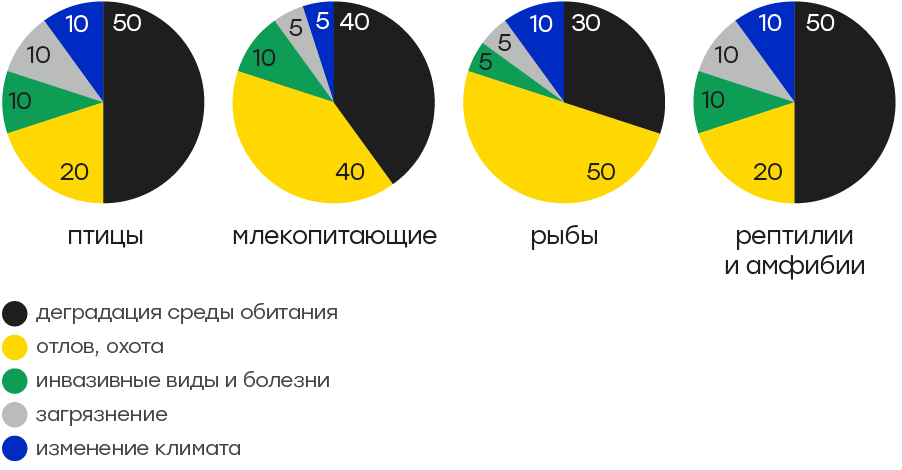 С 1970-го по 2014 годы мировые популяции млекопитающих, птиц, рыб, рептилий и амфибий сократились в среднем на 60%.